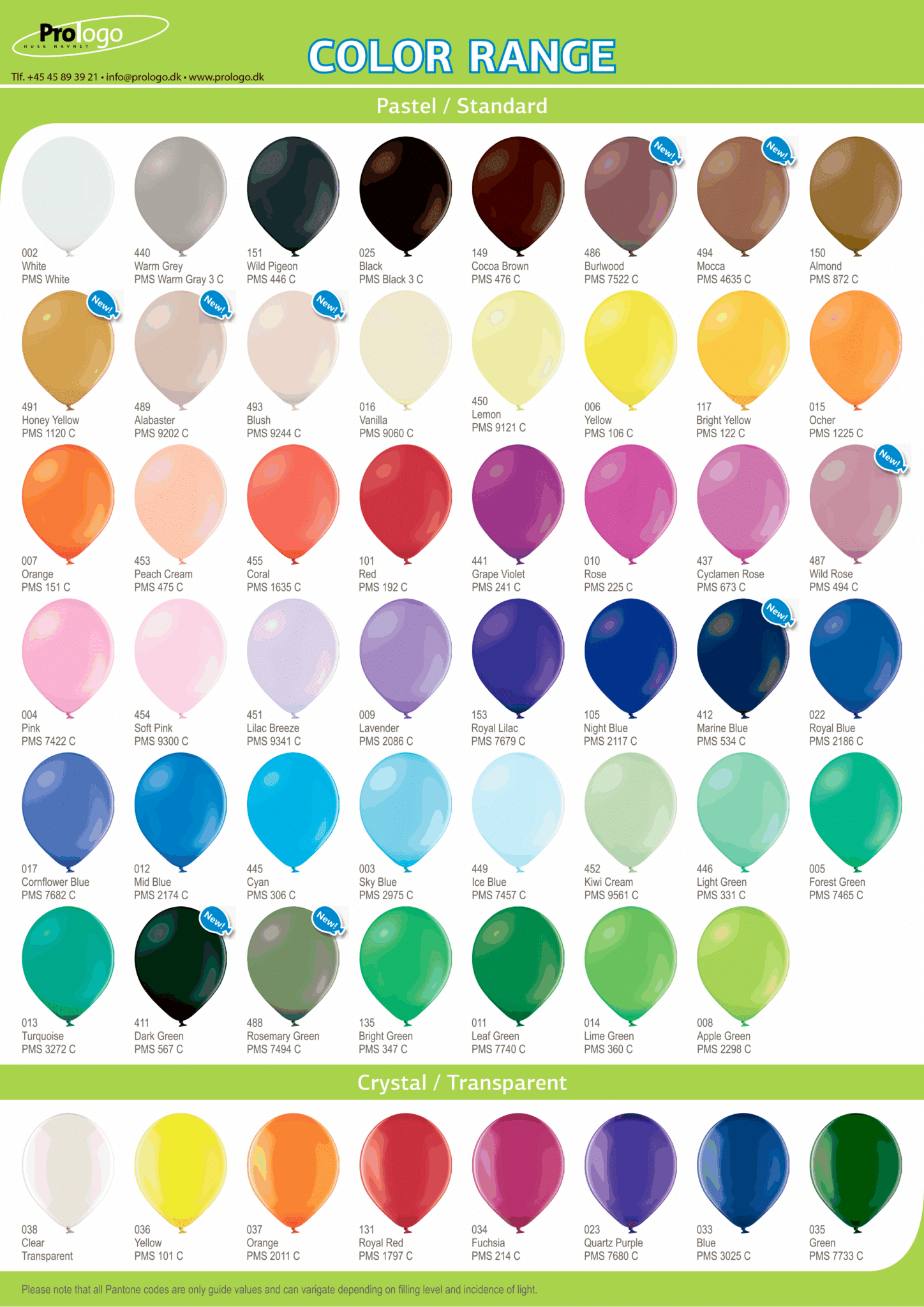 Vi kan levere balloner i mange farver, se farvekort herover på, Pastel og Crystal farvet balloner samt Metallic og Crome / Glossy farvet balloner.